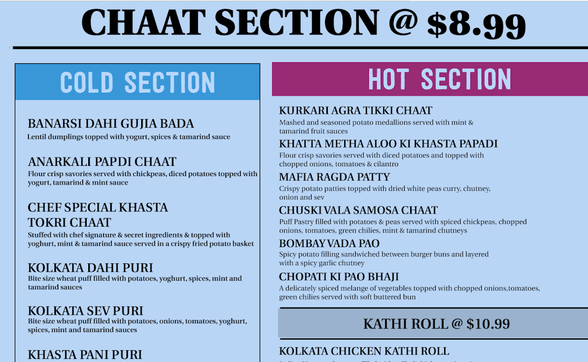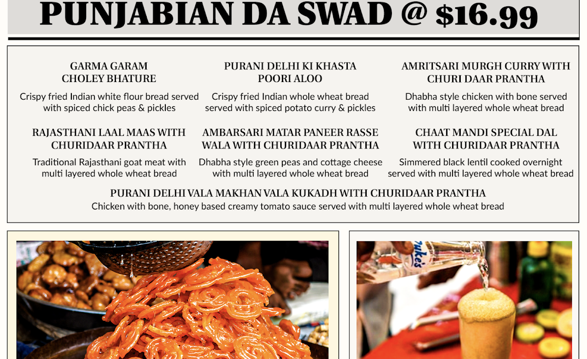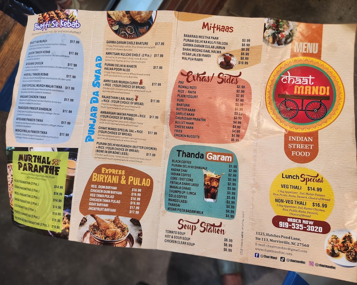 When you step into Chaat Mandi, the vibrant flavors of India come to life on every plate. The Chaat Mandi Menu offers a delightful range of savory snacks, each packed with bold spices and unique textures. Whether you’re craving crispy, tangy samosas, spicy bhel puri, or the sweet and tangy golgappas, there's something to excite every taste bud. Located at 1125 Hatches Pond Ln Suite 113 in Morrisville, NC, this spot is perfect for sharing flavorful bites with friends or indulging in a quick solo snack. Each dish is crafted with authenticity, bringing the heart of Indian street food to the table. The menu is filled with tempting options, including a variety of chaats, chaats that come with a twist, and delicious desserts to end your meal on a sweet note. Don’t forget to try their refreshing drinks, which perfectly complement the spiciness of the dishes.
